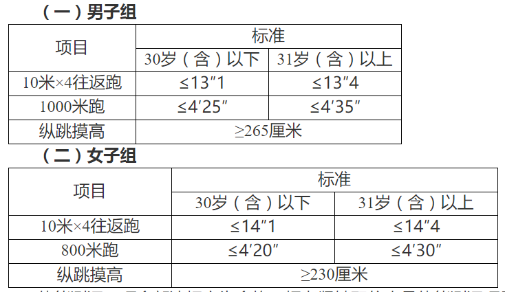 體能測(cè)評(píng)三項(xiàng)全部達(dá)標(biāo)方為合格。報(bào)考緊缺職位人員體能測(cè)評(píng)項(xiàng)目三項(xiàng)中有兩項(xiàng)達(dá)標(biāo)的,視為合格。體能測(cè)評(píng)項(xiàng)目中,縱跳摸高項(xiàng)目的測(cè)評(píng)次數(shù)不超過(guò)3次,10米×4往返跑項(xiàng)目的測(cè)評(píng)次數(shù)不超過(guò)2次,男子1000米跑、女子800米跑項(xiàng)目的測(cè)評(píng)次數(shù)為1次。