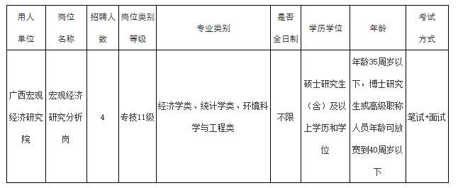 本次公開(kāi)招聘實(shí)名編制工作人員4名,要求普通高等學(xué)校畢業(yè),經(jīng)濟(jì)學(xué)類(lèi)、統(tǒng)計(jì)學(xué)類(lèi)和環(huán)境科學(xué)與工程類(lèi)專(zhuān)業(yè),具有碩士研究生(含)及以上學(xué)歷和學(xué)位,年齡35周歲以下(年齡截止報(bào)名首日),博士研究生或高級(jí)職稱(chēng)人員年齡可放寬到40周歲以下(年齡截止報(bào)名首日)。