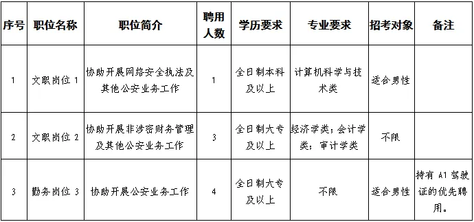 (六)同等條件下,優(yōu)先招聘公安烈士和因公犧牲公安民警、在職公安民警子女、退役士兵、見義勇為積極分子和先進個人、警察類或政法類院校畢業(yè)生、有政法工作經驗的人員;