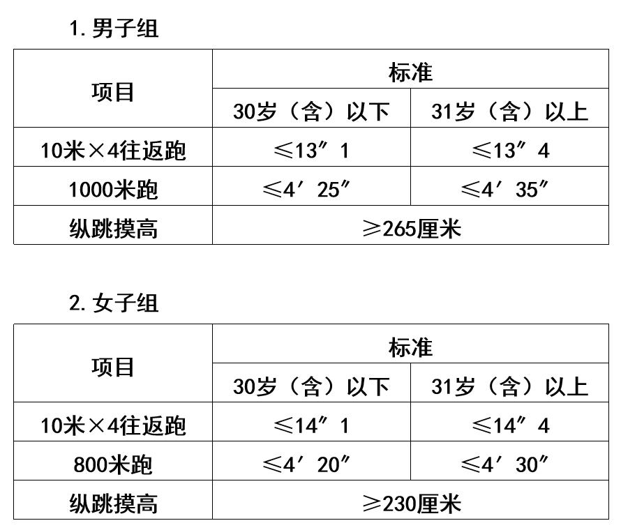 體能測評的項目和標(biāo)準(zhǔn)按照《關(guān)于印發(fā)〈公安機(jī)關(guān)錄用人民警察體能測評項目和標(biāo)準(zhǔn)〉的通知》(公政治〔2024〕60號)執(zhí)行,其中綜合管理類、執(zhí)法勤務(wù)類職位測查全部3個項目,警務(wù)技術(shù)類職位免予測查1000米(男)/800米(女)跑項目。對于專業(yè)人才緊缺難以形成競爭的特殊職位(緊缺職位),體能測評三項中有兩項達(dá)標(biāo)的,視為合格。凡應(yīng)測項目中任意一項不達(dá)標(biāo)的,即為體能測評不合格。具體如下: