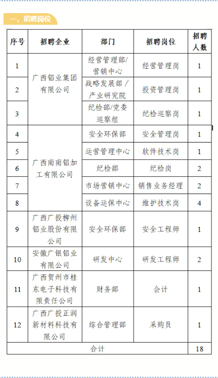 2.報(bào)名方式:應(yīng)聘者可登錄廣投集團(tuán)官方網(wǎng)站(http://www.gig.cn),依次點(diǎn)擊“人力資源-廣納英才”,進(jìn)入“社會(huì)招聘-招聘崗位”專欄,找到“鋁業(yè)”相應(yīng)崗位并投遞簡歷。