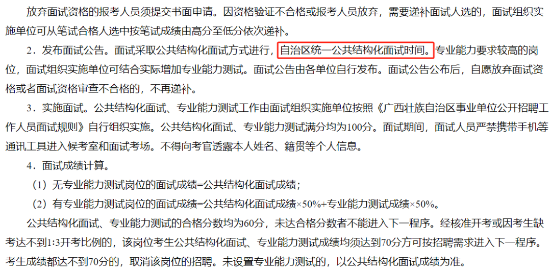 還剩下廣西區(qū)直單位(招錄1535人)的大部分面試資審名單尚未發(fā)布,不過這兩天各個區(qū)直單位應該也會發(fā)完了。廣西各地市是什么時候面試?大概、也許、廣西地市也是6月14、15日面試哦,由區(qū)直事業(yè)單位、南寧事業(yè)單位等招錄公告可知“面試采取公共結構化面試方式進行,自治區(qū)統(tǒng)一公共結構化面試時間”,事業(yè)單位大部分都是結構化面試,而根據下方網傳圖片(面試時間定于6月14、15日),今年各地市可能真的統(tǒng)一面試時間,我們拭目以待: