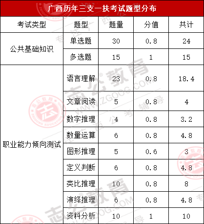 上篇我們寫到,三支一扶的待遇,在廣西這個(gè)待遇還算不錯(cuò),政策上的支持也非常好,那么預(yù)計(jì)這個(gè)月月底出公告的三支一扶,啥時(shí)候筆試呢?2024年廣西三支一扶筆試時(shí)間是7月13日,其筆試科目為《綜合知識(shí)》一科,滿分100分。基于往年考生的回憶,綜合知識(shí)內(nèi)容主要包括公共基礎(chǔ)知識(shí)和行測(cè)職業(yè)能力測(cè)試兩個(gè)科目,而各題型的題量及分值如下圖所示: