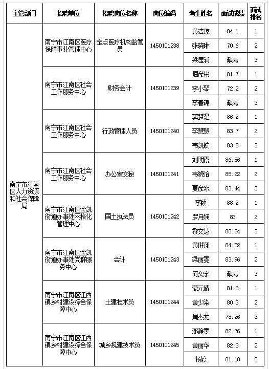 南寧市江南區(qū)人力資源和社會(huì)保障局2025年公開(kāi)考試招聘事業(yè)單位工作人員面試成績(jī)表