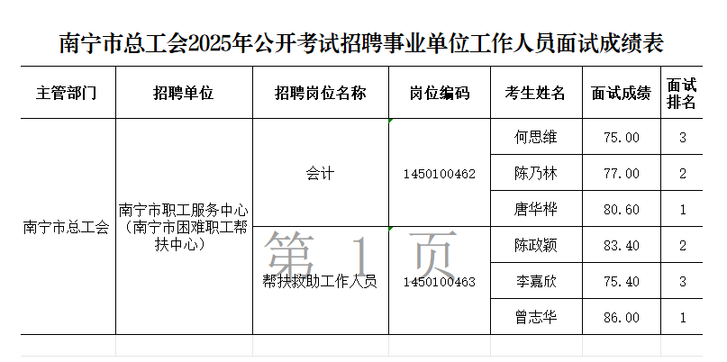 原文標題:南寧市總工會2025年公開考試招聘事業(yè)單位工作人員面試成績表
