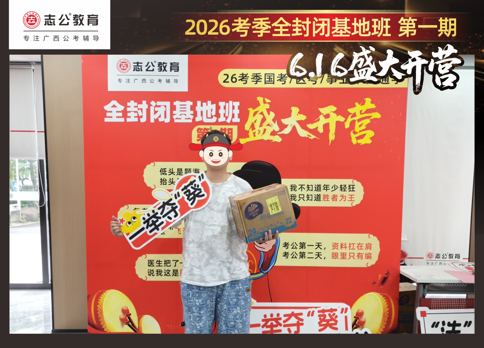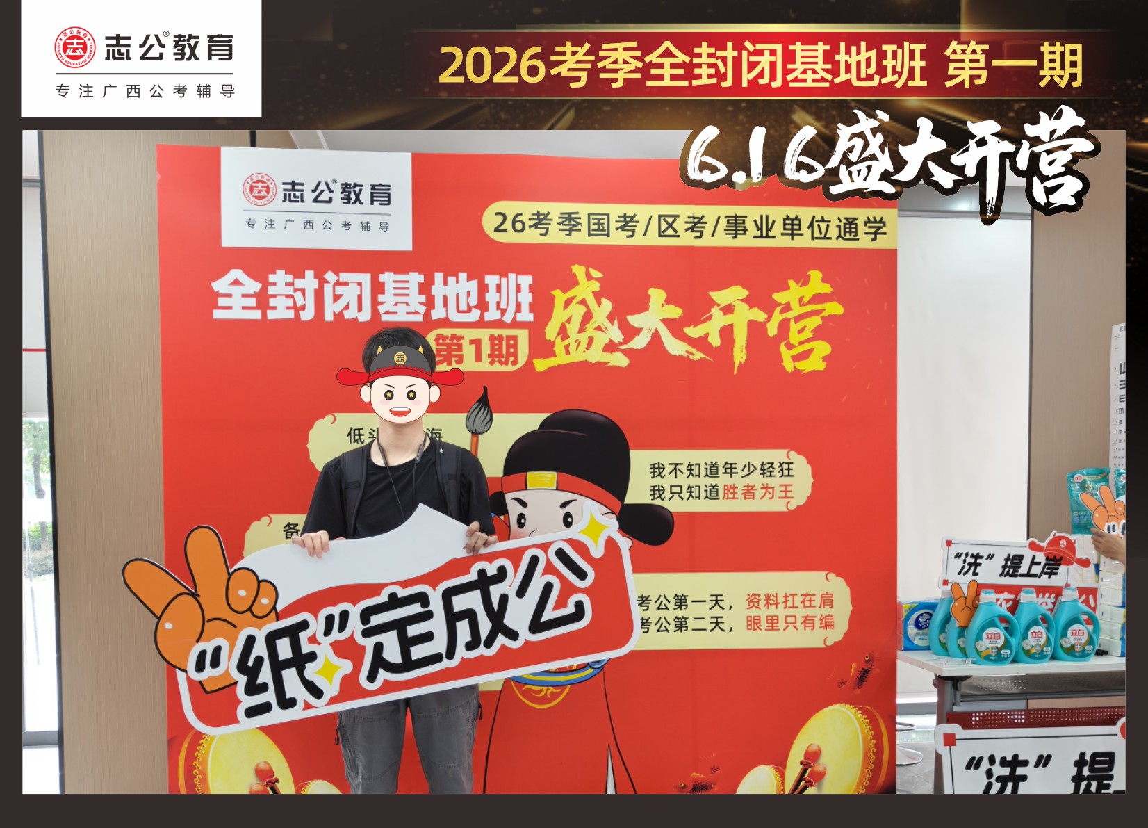 今天的開班還有一系列小活動(dòng)噢~瞧!——“學(xué)員打卡活動(dòng)”,所有今天到場(chǎng)的基地班學(xué)員,通過做一些小任務(wù)的方式,可以到前臺(tái)領(lǐng)取生活禮包即可領(lǐng)取生活禮品1份(一提六包的紙巾,或者一瓶洗衣液),這也是志公教育對(duì)所有學(xué)員的美好祝愿,預(yù)祝大家未來能夠“紙”定成公,“洗”提上/岸,“衣舉成公”!