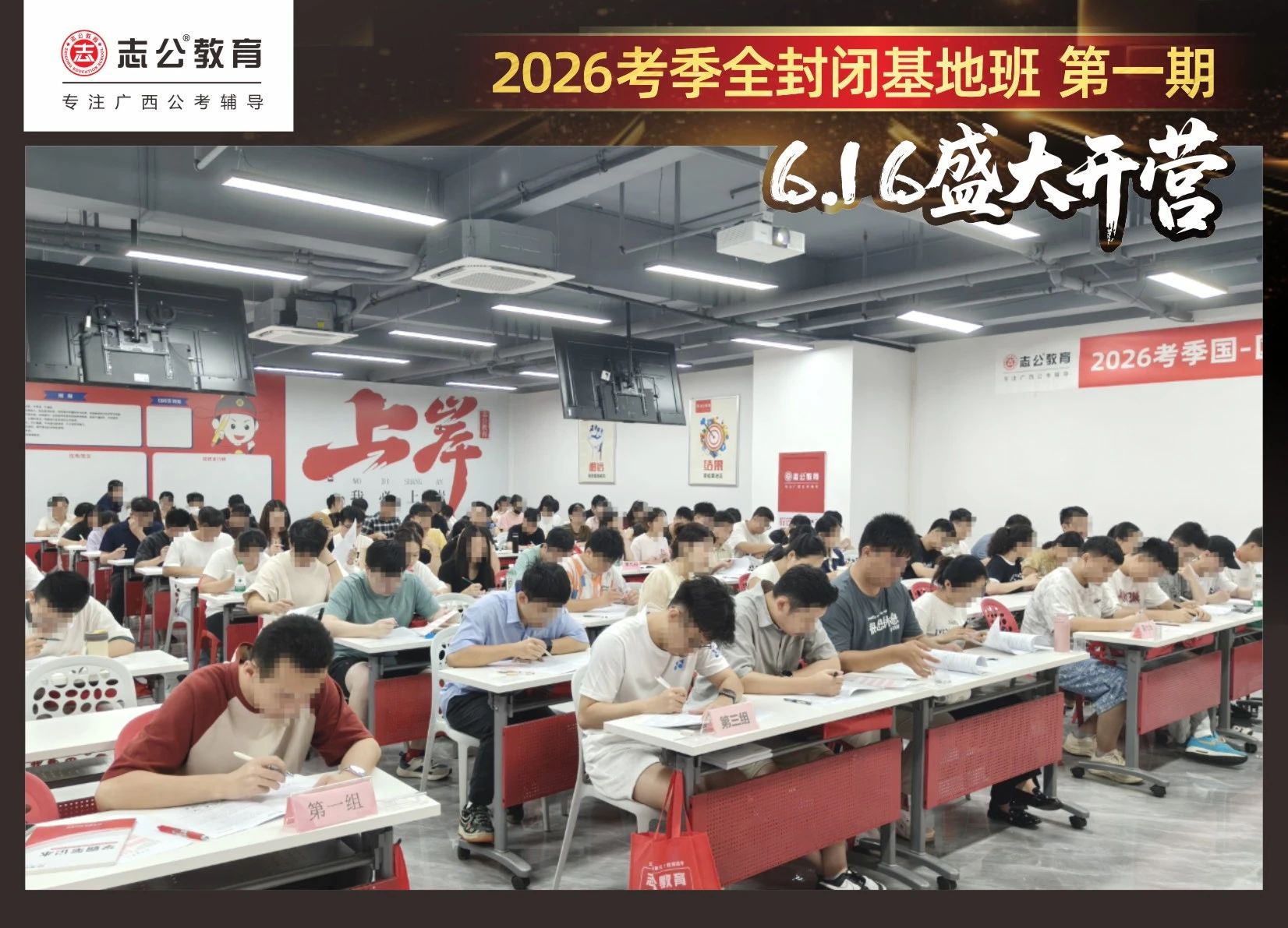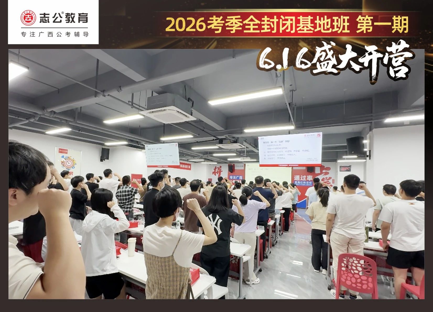 大家稍作休息之后,就是咱們期待已久的開班典禮啦!學(xué)員們?cè)诎嘀魅蔚囊龑?dǎo)下分組就坐。大家目光灼灼,熱情高漲,迫不及待想要開啟學(xué)習(xí)模式??催@座無虛席的盛況,志公26考季全封閉基地班第1期課程實(shí)力名不虛傳,各位學(xué)員用飽滿的熱情和積極的態(tài)度迎接此次課程的開展,期待大家能夠完成自己的蛻變和成長!