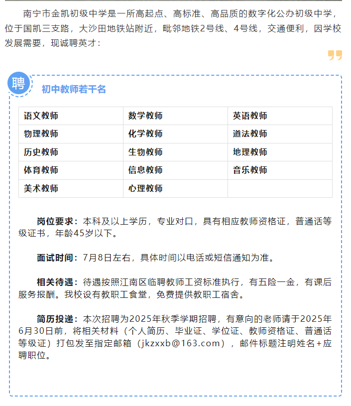 原文標題:南寧市金凱初級中學2025年秋季學期招聘公告