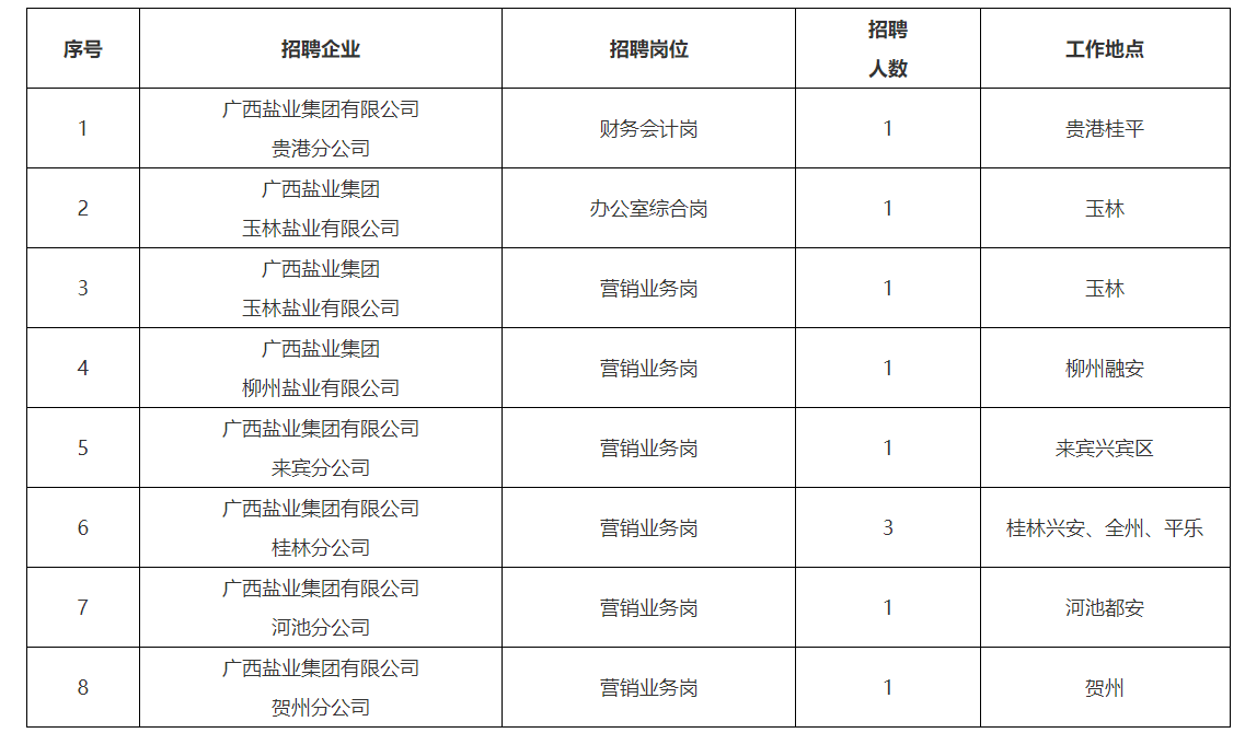 具體招聘崗位、任職要求、崗位職責(zé)見(jiàn)附件《廣西鹽業(yè)集團(tuán)招聘崗位職責(zé)及任職要求》。