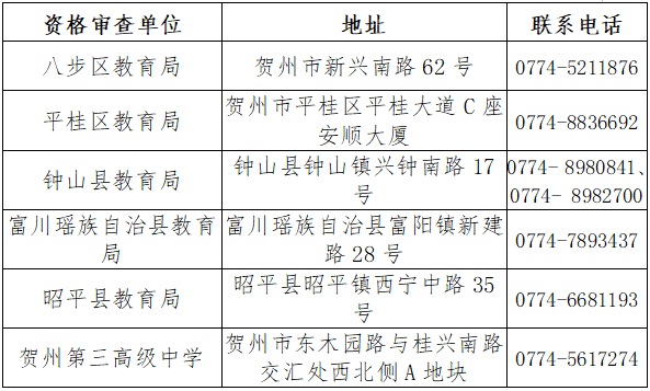 詳見已發(fā)布的《2025年賀州市中小學(xué)(幼兒園)教師公開招聘簡章》附件1《2025年賀州市中小學(xué)(幼兒園)教師公開招聘崗位計(jì)劃表》,資格審查單位信息如下表: