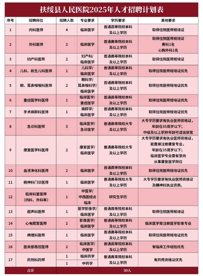 為進一步充實現(xiàn)有人才隊伍,促進醫(yī)院學(xué)科發(fā)展,提升醫(yī)院綜合實力,結(jié)合醫(yī)院實際工作需要,扶綏縣人民醫(yī)院決定面向社會進行公開招聘各類醫(yī)學(xué)人才,具體招聘事宜如下: