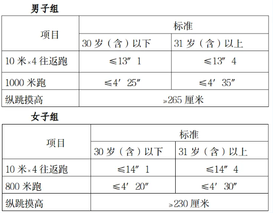 2.體測(cè)項(xiàng)目和標(biāo)準(zhǔn)。參照《關(guān)于印發(fā)公安機(jī)關(guān)錄用人民警察體能測(cè)評(píng)項(xiàng)目和標(biāo)準(zhǔn)(暫行)的通知》(人社部發(fā)〔2011〕48號(hào))的項(xiàng)目及測(cè)試規(guī)則,結(jié)合《公安民警體育鍛煉達(dá)標(biāo)手冊(cè)》成績(jī)標(biāo)準(zhǔn),本次體能測(cè)評(píng)的項(xiàng)目和標(biāo)準(zhǔn)如下: