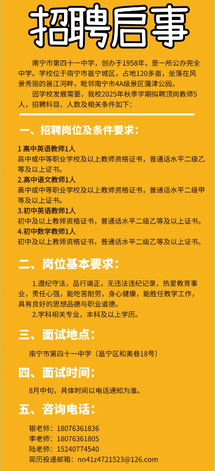 原文標題:2025年秋季學(xué)期南寧市第四十一中學(xué)關(guān)于公開招聘頂崗教師的啟事