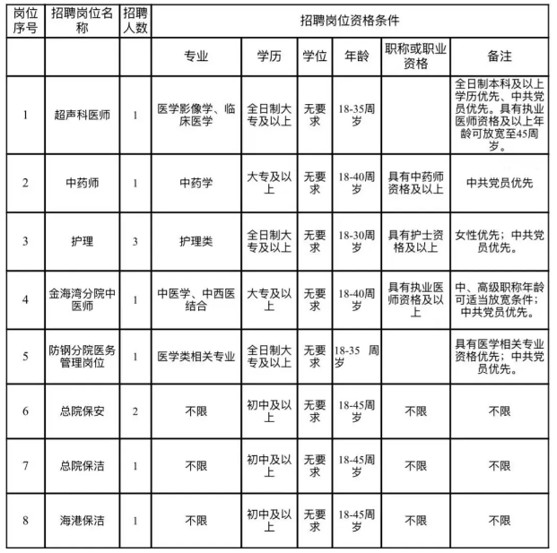 為了解決醫(yī)院人員緊缺狀態(tài),完善科室設(shè)置,進(jìn)一步提升醫(yī)療服務(wù)水平,確保醫(yī)療安全,更好地滿足企沙工業(yè)園區(qū)各大企業(yè)及廣大人民群眾醫(yī)療服務(wù)需求,特面向社會(huì)招聘11名工作人員,具體如下: