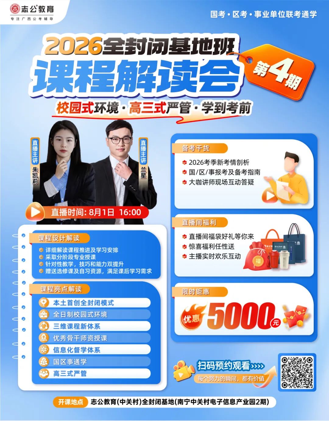 本次解讀會邀請到了朱凱莉、蘭星等資深講師。他們長期深耕公考領(lǐng)域,對廣西的公考形勢了如指掌。在解讀會上,講師們將為大家深度剖析2026考季的新考情、分享報(bào)考及備考指南,與同學(xué)們進(jìn)行現(xiàn)場互動,更重要的是進(jìn)行2026年全封閉基地班第4期課程設(shè)計(jì)解讀!讓你在備考之初就搶占先機(jī)。????