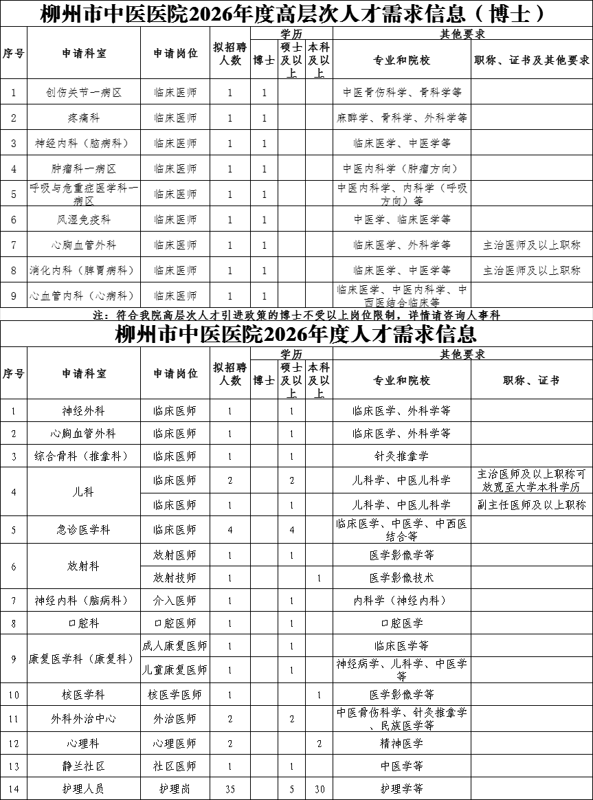 高層次人才不受招聘崗位限制,均可一事一議、一人一議。高層次人才(博士)根據(jù)醫(yī)院引進(jìn)人才制度,給予25萬-120萬元安家費(fèi)、5萬-20萬元科研啟動經(jīng)費(fèi)。引進(jìn)的高層次人才(高級職稱或博士研究生)按柳州市有關(guān)政策提供事業(yè)編制,協(xié)助其解決子女入學(xué)和配偶工作。2026年醫(yī)學(xué)類緊缺人才擬招聘醫(yī)師7人,緊缺人才科室為心理科(精神衛(wèi)生專業(yè))、神經(jīng)外科、急診醫(yī)學(xué)科,擬享受柳州市中醫(yī)醫(yī)院人才引進(jìn)醫(yī)學(xué)類緊缺人才安家費(fèi)2-20萬元,同時(shí)按照國家、廣西壯族自治區(qū)、柳州市及醫(yī)院有關(guān)政策享受工資及福利待遇,獎(jiǎng)勵(lì)性績效工資按照醫(yī)院同級同類人員規(guī)定執(zhí)行。如為學(xué)科帶頭人或高層次人才則另按其標(biāo)準(zhǔn)享受相關(guān)待遇。