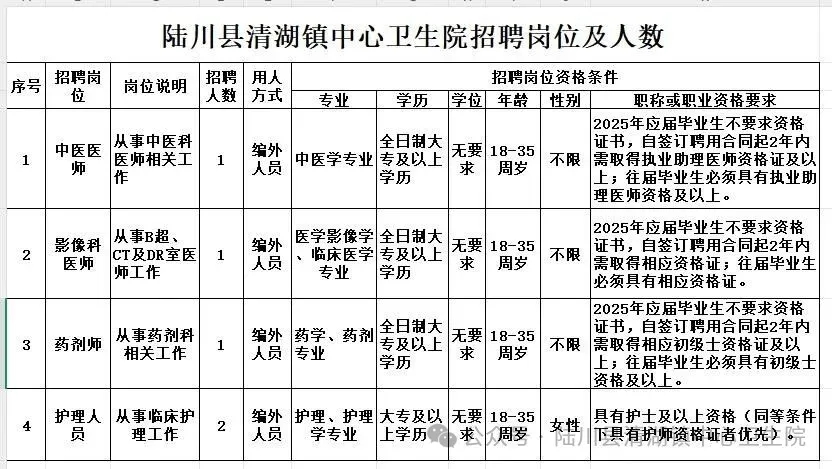 報(bào)名地點(diǎn):陸川縣清湖鎮(zhèn)中心衛(wèi)生院五樓辦公室。