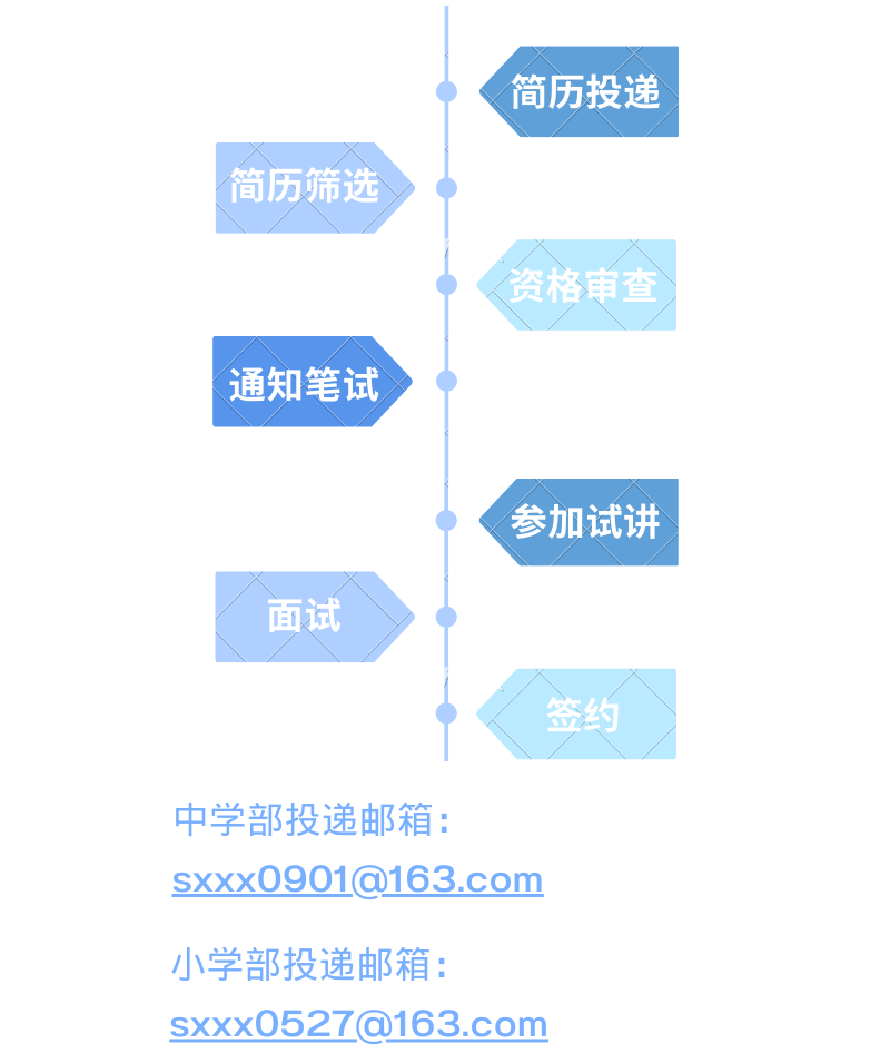 請將個人簡歷(Word或PDF版本)、一張個人生活照以電子郵件附件形式發(fā)送至報名崗位對應(yīng)的郵箱(如有作品,請將作品集一起發(fā)送到報名郵箱),郵件主題和附件文件名請備注:應(yīng)聘學(xué)科+姓名+畢業(yè)學(xué)校。