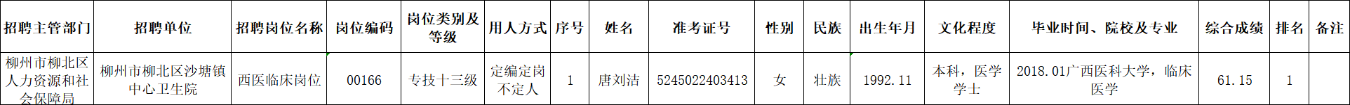 根據(jù)《柳州市2025年度下半年事業(yè)單位公開考試招聘工作人員公告》要求及安排,唐劉潔同志經(jīng)面試、考察、體檢合格,符合聘用條件。經(jīng)研究決定,擬聘用唐劉潔同志為我區(qū)事業(yè)單位工作人員,現(xiàn)予以公示,公示期為5個工作日(2026年1月22日至2026年1月28日)。對擬聘用的同志如有異議,請以書面形式,并署真實(shí)姓名和聯(lián)系地址,于2026年1月28日前郵寄或直接送我單位(地址:柳州市柳北區(qū)鷓鴣江六隊(duì)南200米(北外環(huán)路南)柳北區(qū)衛(wèi)生健康局512室;郵編:545002,電話0772-2802642),群眾如實(shí)反映有關(guān)問題受法律保護(hù)。