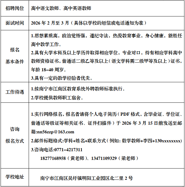 2026年春季學期南寧市第五十六中學編外教師招聘若干人