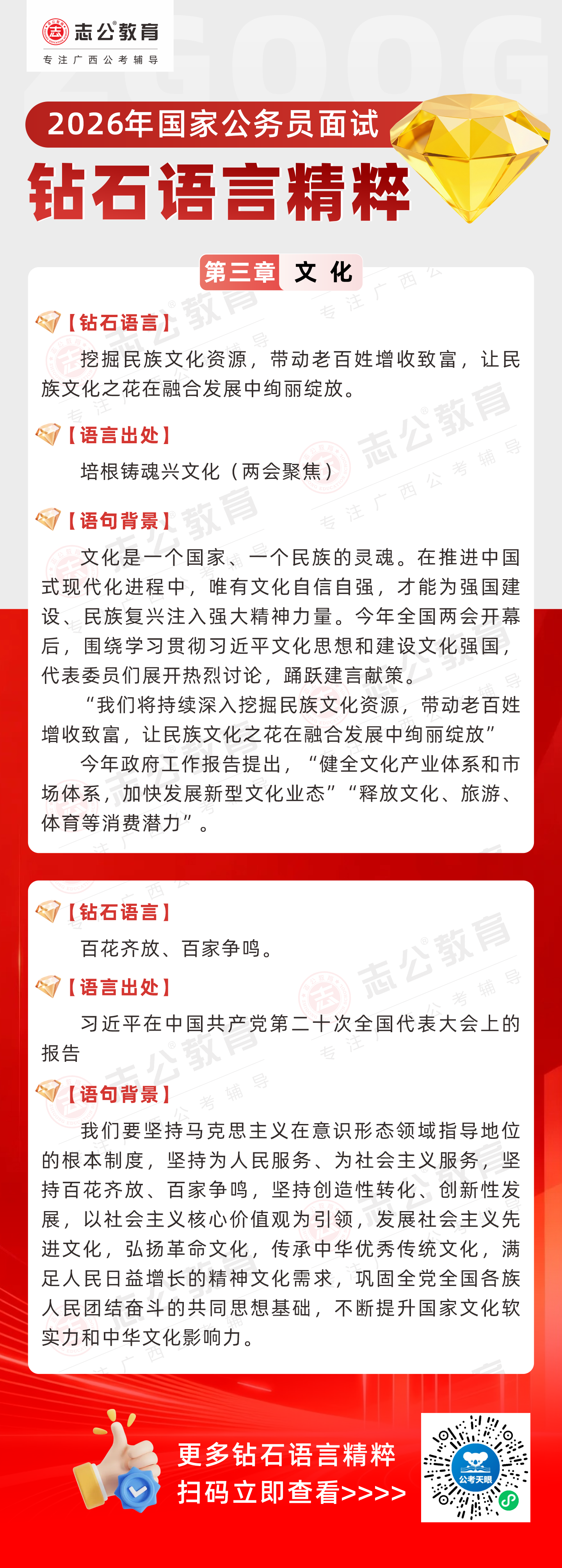 志公教育推出《2026國(guó)家公務(wù)員面試·鉆石語言精粹》文化篇!幫助考生把握文化類題目應(yīng)答邏輯,提升語言表達(dá)層次,助你在面試中脫穎而出。備考2026國(guó)考面試,從掌握“鉆石語言”開始!