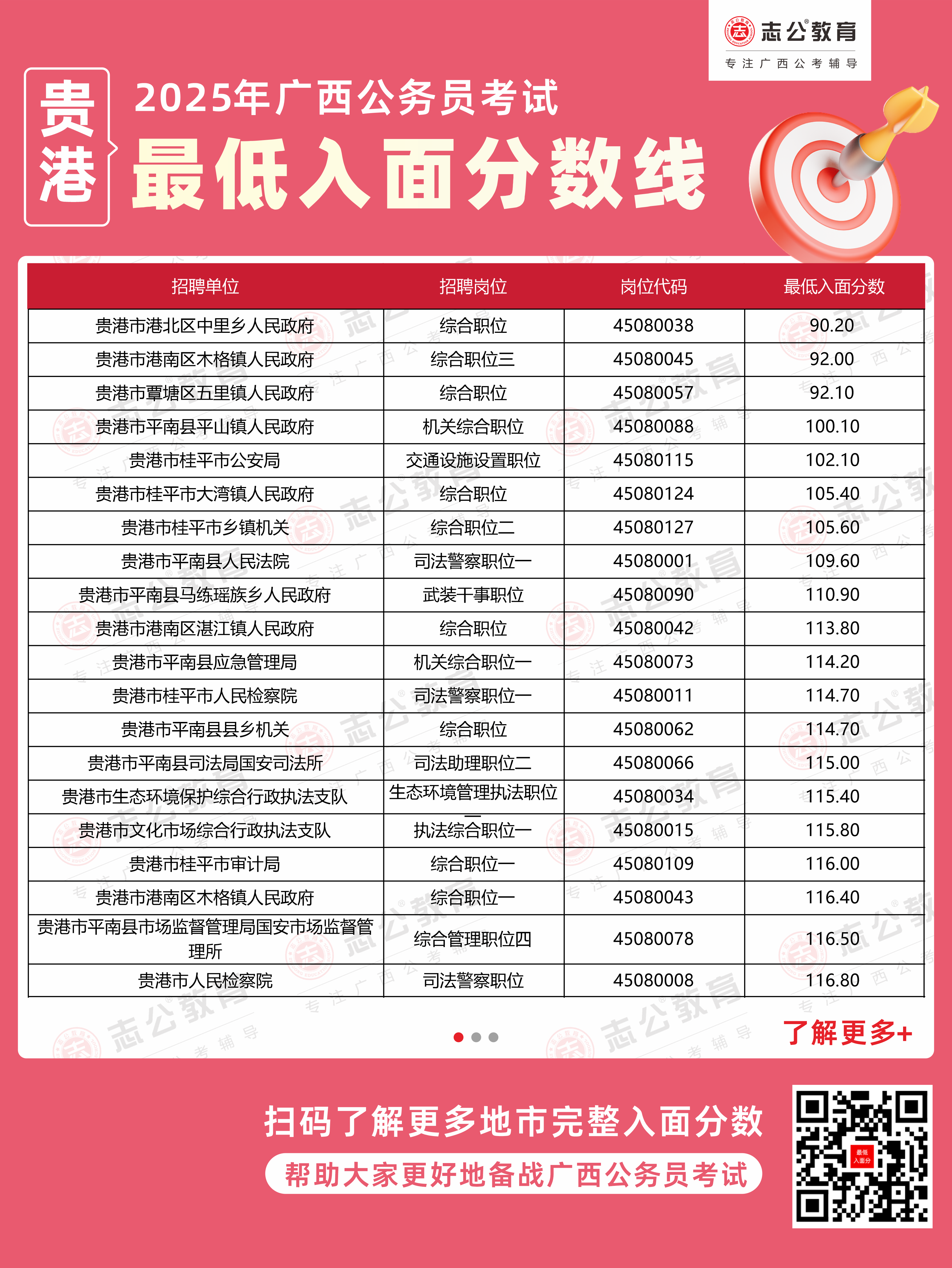 以下為志公教育根據官方發(fā)布的面試資格審查公告及公開數據整理的貴港市部分單位的進面最低筆試分數(含照顧加分),數據僅供參考,具體以官方實際公布為準。